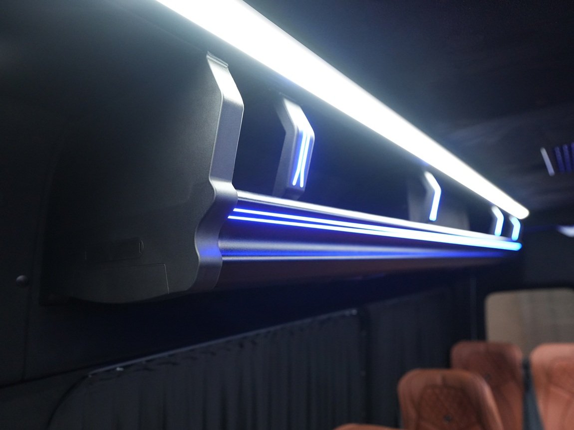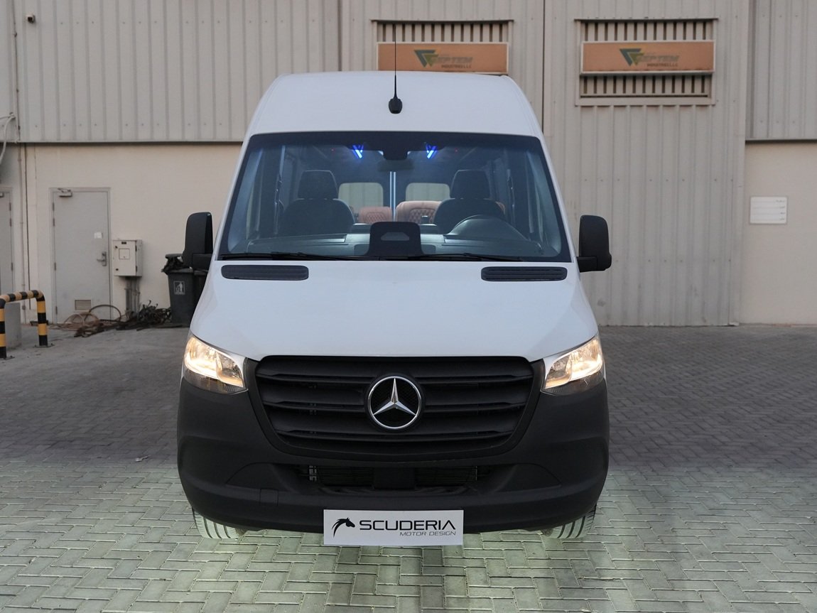 Scuderia Motor Design specializes in converting the Mercedes Sprinter van into a Mercedes Sprinter Van 16 Seater, tailored to meet the unique needs of professionals on the go. Moreover, the business edition conversion by SMD maximizes the functionality and productivity of the Sprinter van, creating a professional and well-equipped workspace. The conversion includes features such as comfortable seating arrangements, ergonomic workstations, ample storage solutions, and integrated technology for seamless connectivity. Additionally, with a focus on efficiency and versatility, the business edition conversion ensures that every inch of the Sprinter van is optimized for business activities. Whether it be mobile office work, client meetings, or product demonstrations, Scuderia Motor Design’s expertise in luxury interior design guarantees a sophisticated and functional workspace that aligns perfectly with the discerning requirements of business professionals.Mercedes Sprinter Van 18 Seater
